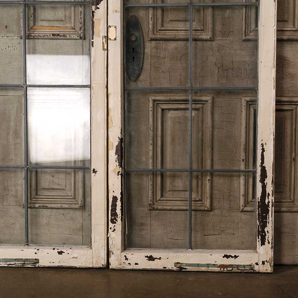 Set of two architectural salvage antique leaded glass casement windows in painted wood sashes together measuring approx. 49 7/8" wide x 66 5/8" tall x 1 3/4" thick. See photos to evaluate condition. Priced at $350 for the two piece set.