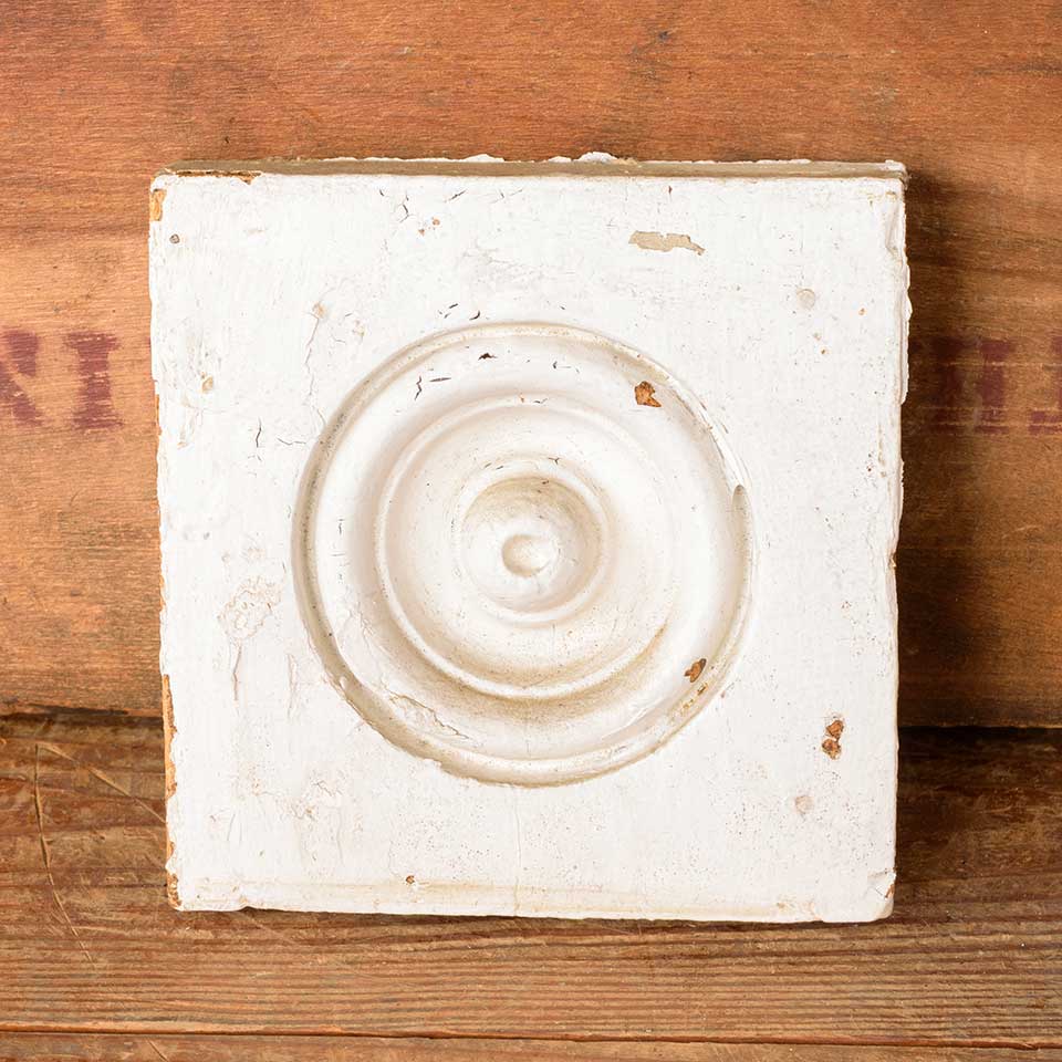 Architectural salvage antique interior window or door painted wood rosette trim block measuring approx. 5 1/2" x 5 1/2" x 1 1/4" front to back. Color and condition vary.