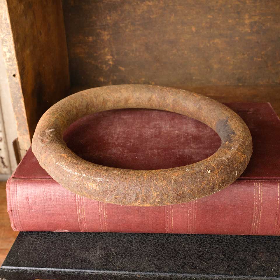 Architectural salvage antique large wrought iron ring measuring approx. 6 1/2" in diameter x 7/8" thick with an interior opening 4 3/4" in diameter. See photos to evaluate condition.