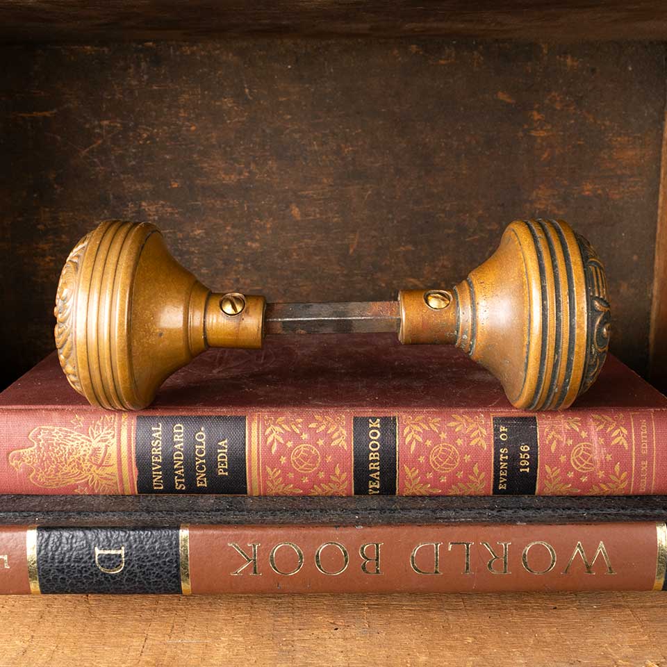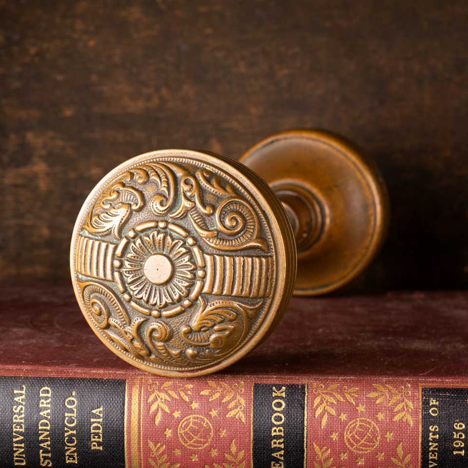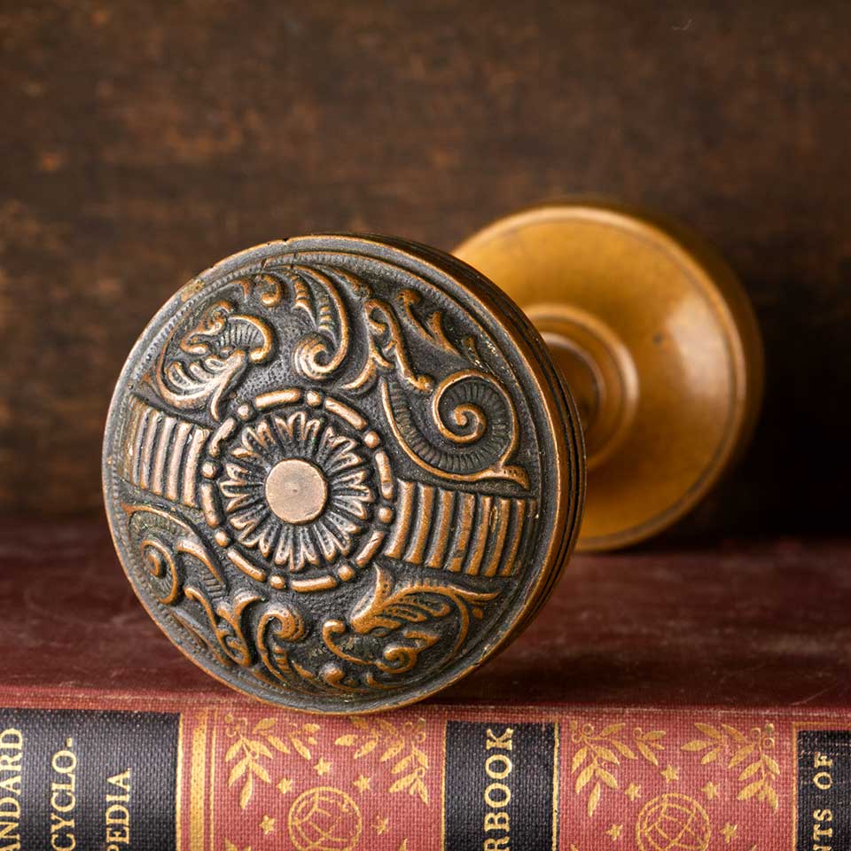 Set of architectural salvage antique brass Penn Hardware Company Portulaca pattern c. 1895 doorknobs door hardware. The set includes two ornately decorated doorknobs (2 1/4" in diameter with a 3/4" diameter stem) and a tapped spindle with set screws. See photos to evaluate condition. Priced at $225 for the set.