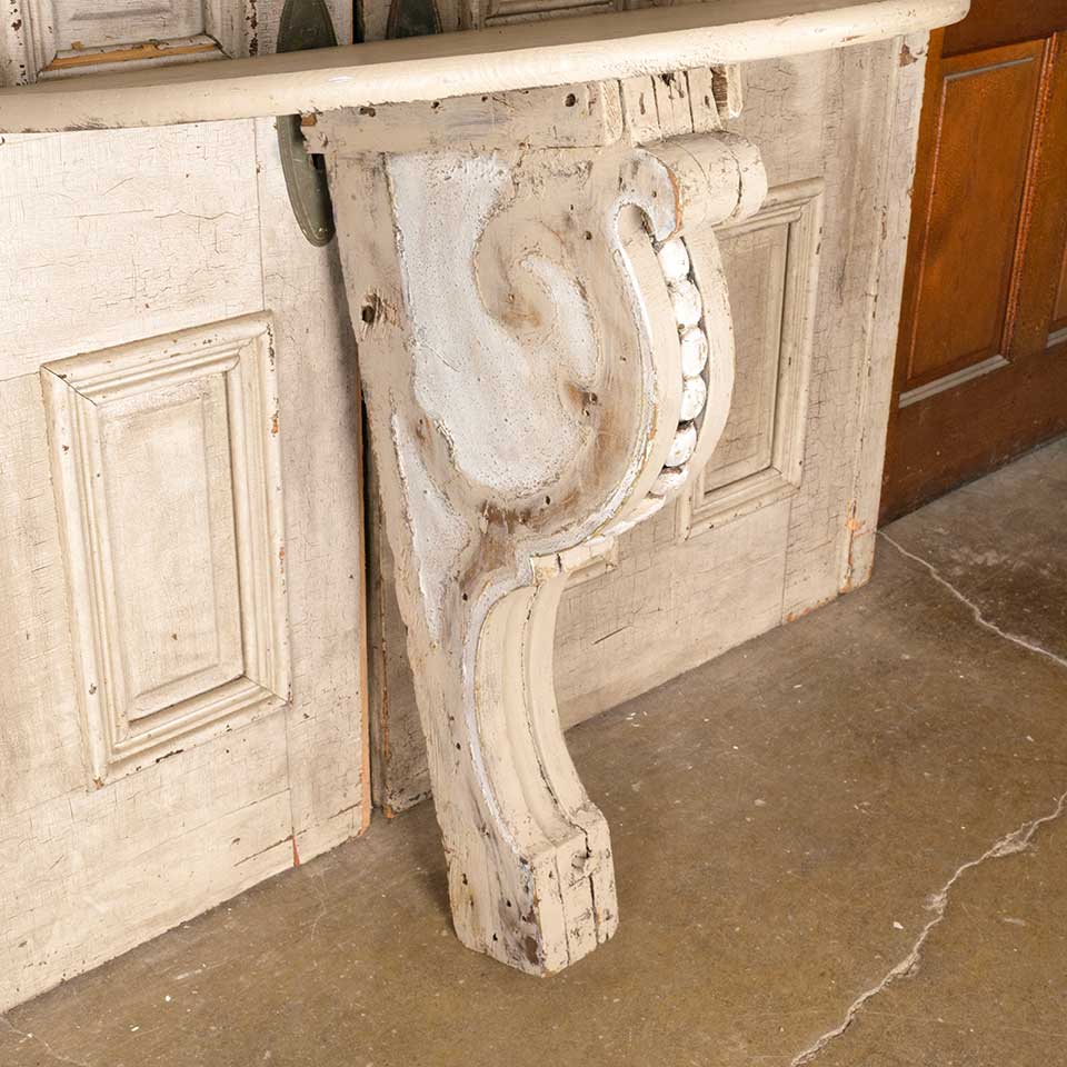 Repurposed architectural salvage antique painted wood house corbel bracket demilune console table measuring approx. 36" wide x 37 3/4" tall x 23" front to back. See photos to evaluate condition.