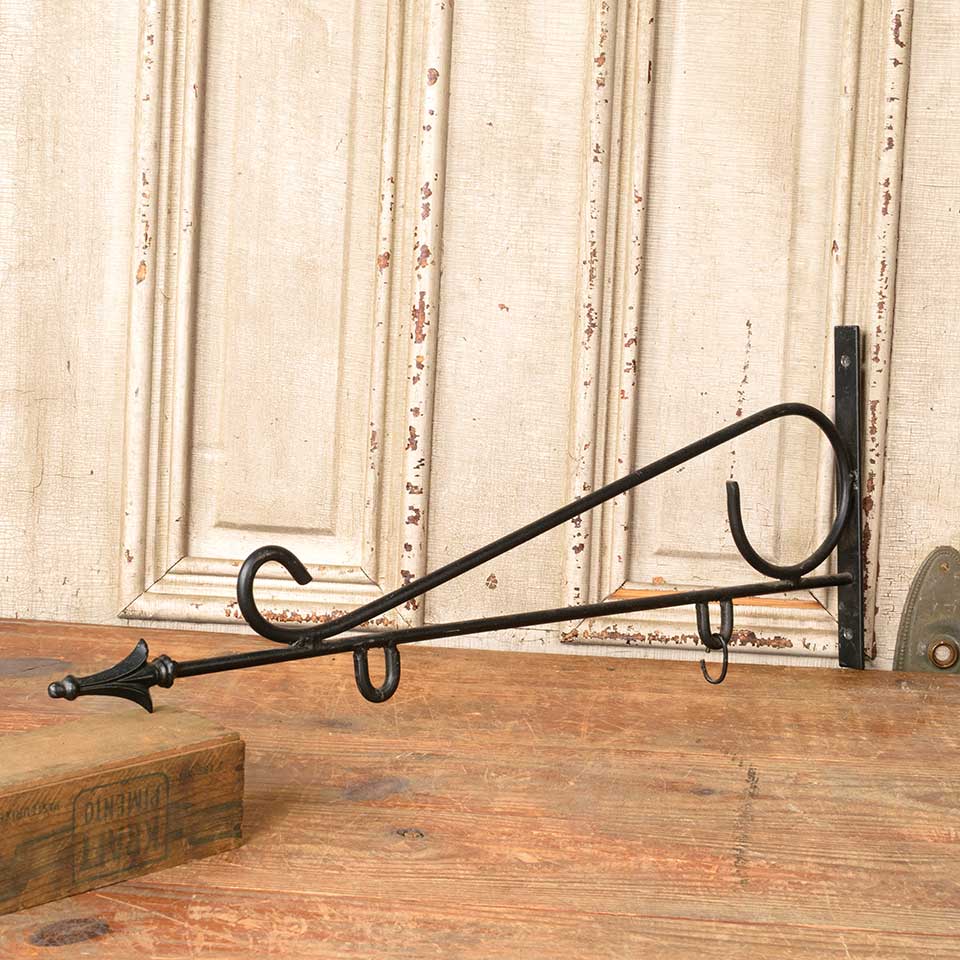 Architectural salvage wrought iron sign bracket measuring approx. 1" wide x 10 1/2" tall x 26 1/2" front to back. Color and condition may vary.