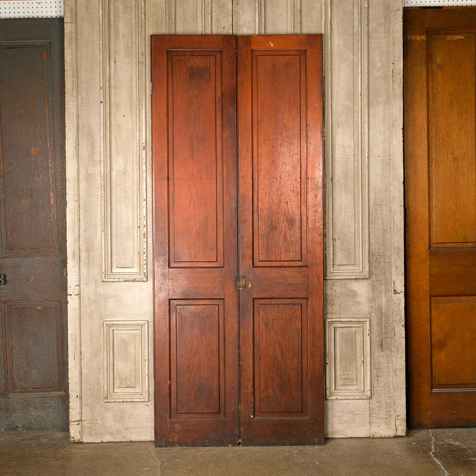 Set of two architectural salvage antique two panel pine wood cabinet doors together measuring approx. 36 1/4" wide x 86 3/4" tall x 1 1/8" thick. See photos to evaluate condition. Priced at $195 for the set of two doors.