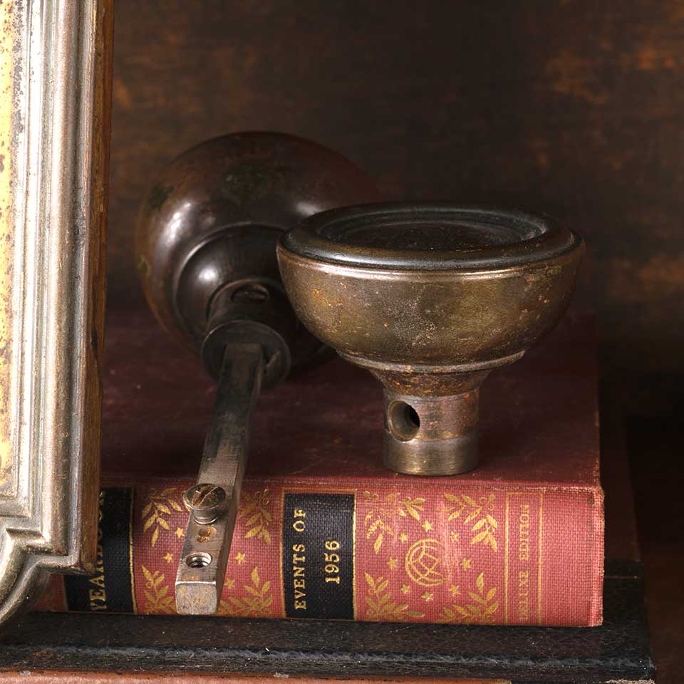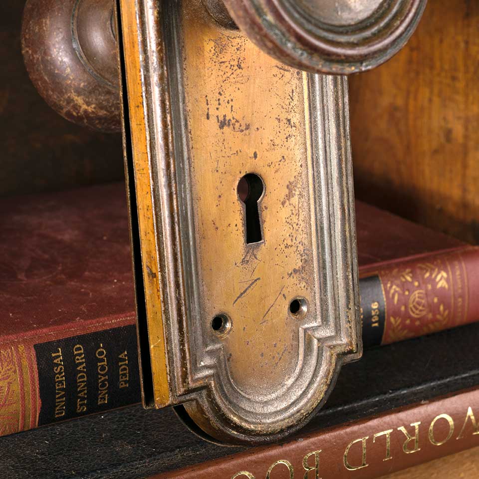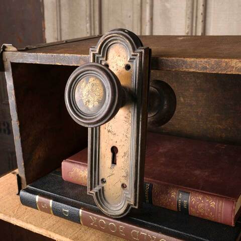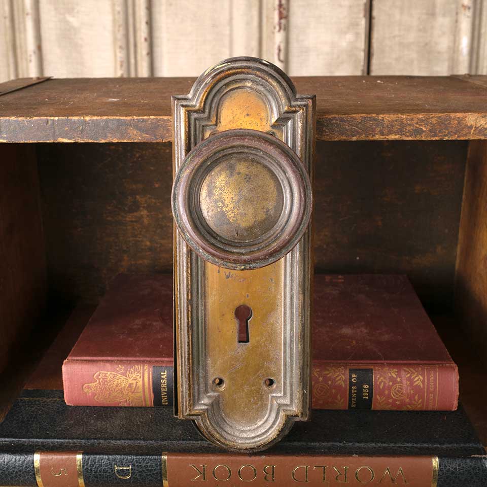 Architectural salvage antique Arts & Crafts metal interior door hardware set including 2 doorknobs (2 1/4" diameter), 2 backplates (2 5/8" x 7 5/8" x 1/4" with spindle and keyholes 2 1/2" on center), and a tapped doorknob spindle with set screws. Color and condition vary. Priced at $175/set.