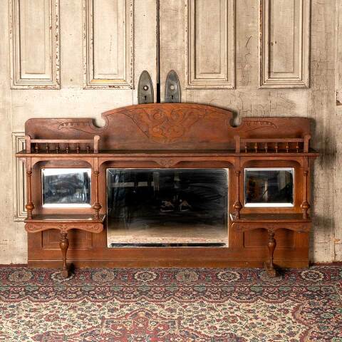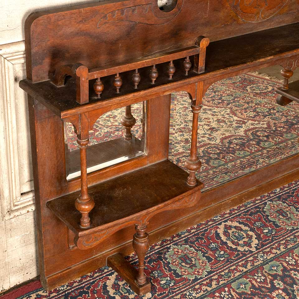 Architectural salvage antique Victorian oak wood overmantel with beveled glass mirrors measuring approx. 56" wide x 32 1/4" tall x 7 1/2" front to back. See photos to evaluate condition.