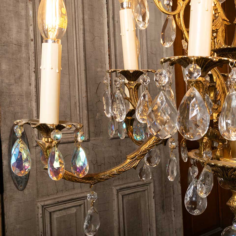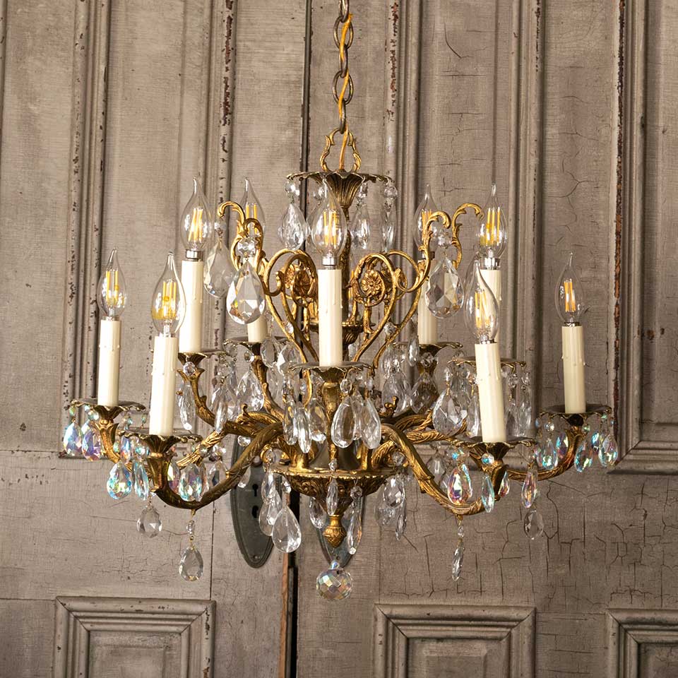 Architectural salvage antique ten bulb chandelier light fixture with glass prisms measuring approx. 23 1/2" diameter x 38 1/4" tall. See photos to evaluate condition. Salvaged lighting should be inspected by a licensed electrician prior to installation.