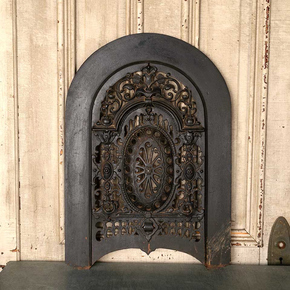 Architectural salvage antique ornate arched top cast iron fireplace summer front cover measuring approx. 18 3/4" wide x 26 1/2" tall x 1 1/2" front to back. See photos to evaluate condition.
