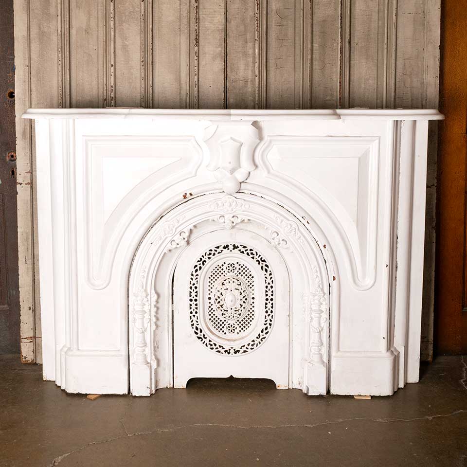Hard to find 3 piece architectural salvage antique Victorian cast iron fireplace mantel / mantle with arched top surround and removable summer front cover. The mantel measures approximately 63 1/2" wide x 45 5/8" tall x 12 3/4" front to back; the surround measures approx. 32" wide x 32 5/8" tall; and the summer front cover measures approx. 18 5/8 " wide x 26 1/2" tall. See photos to evaluate condition. Priced at $4,500 for the 3 piece set.