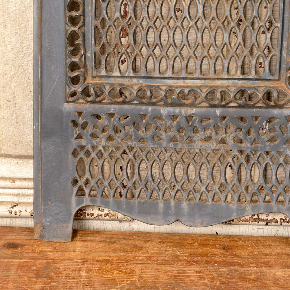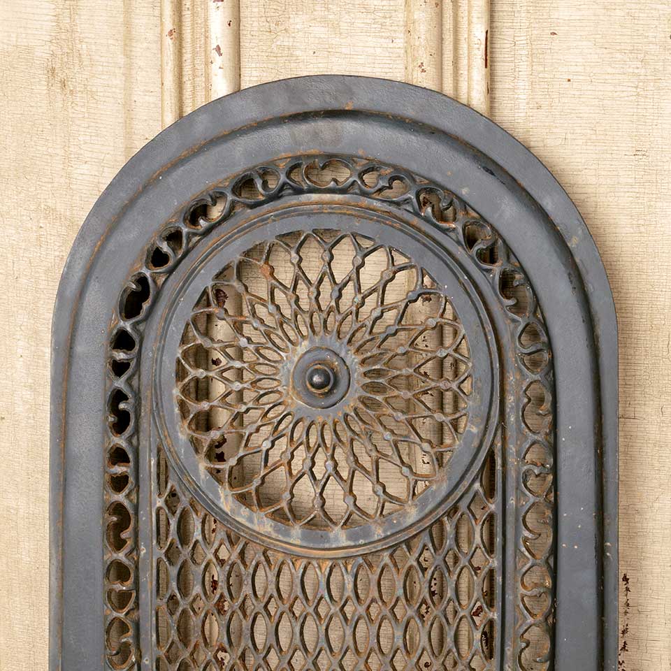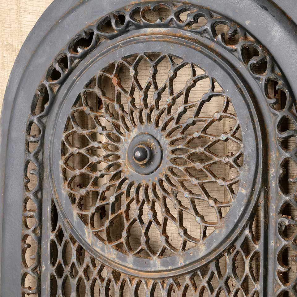 Architectural salvage antique ornate arched top cast iron fireplace summer front cover measuring approx. 14 1/8" wide at base x 23 5/8" tall x 1 3/4" front to back. See photos to evaluate condition.