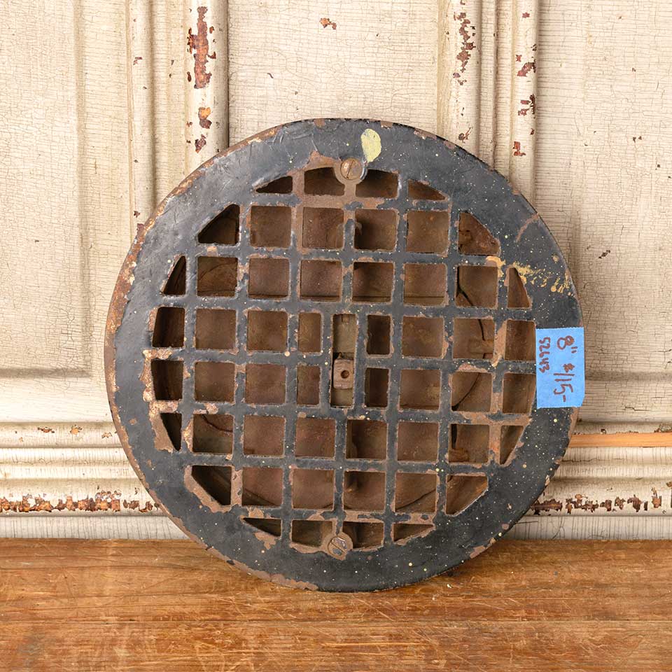 Architectural salvage antique round cast iron heat grate vent cover with operable louvers measuring approx. 8" in diameter (insert dimension) x 9 3/8" in diameter (overall dimension) x 2" front to back. See photos to evaluate condition.