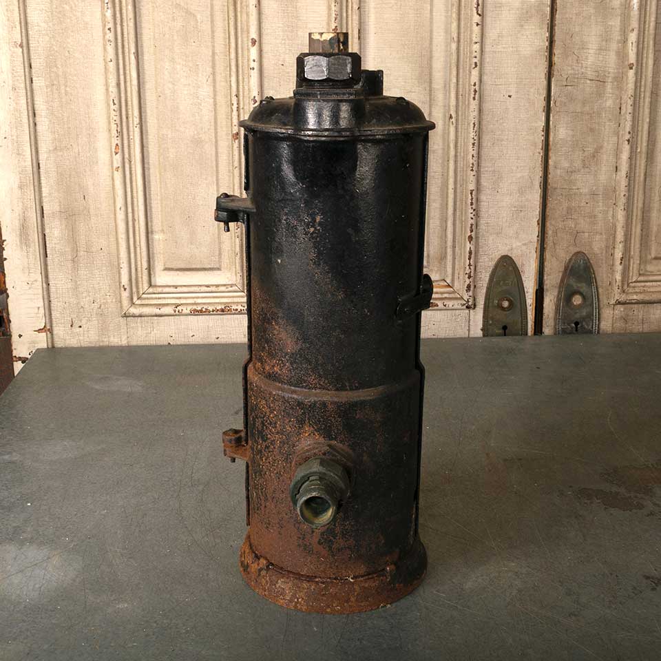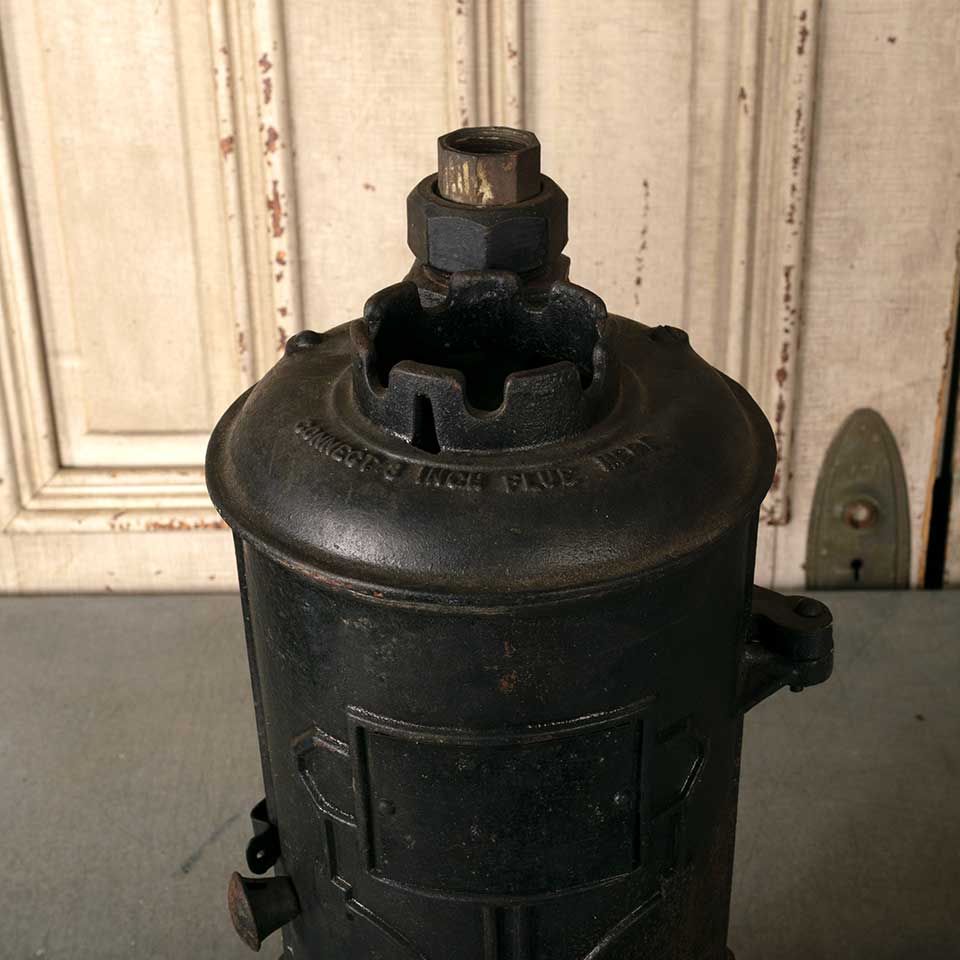 Architectural salvage antique cast iron tankless water heater measuring approx. 20" tall with a 7 1/2" diameter base. See photos to evaluate condition.