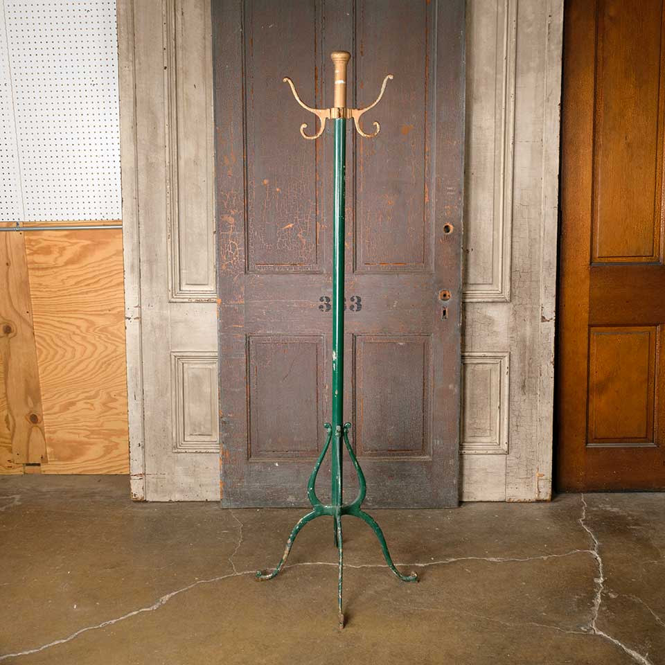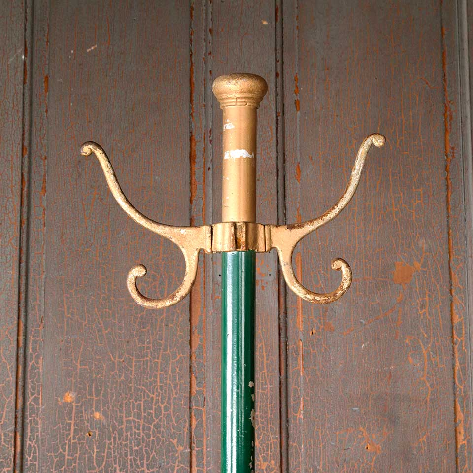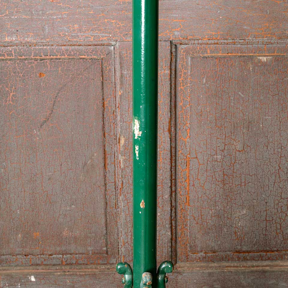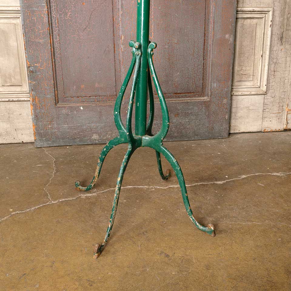 Architectural salvage antique painted metal hall tree coat and hat rack measuring approx. 13 1/2" wide x 70 1/2" tall with a 22 3/4" diameter base. It appears that two of the original hooks are missing. See photos to evaluate condition.