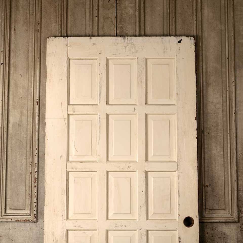 Architectural salvage fifteen panel painted pine wood interior door measuring approx. 35 3/4" wide x 79 1/8" tall x 1 3/4" thick. The wood is split and screwed together at the mortise lock location. See photos to evaluate condition.