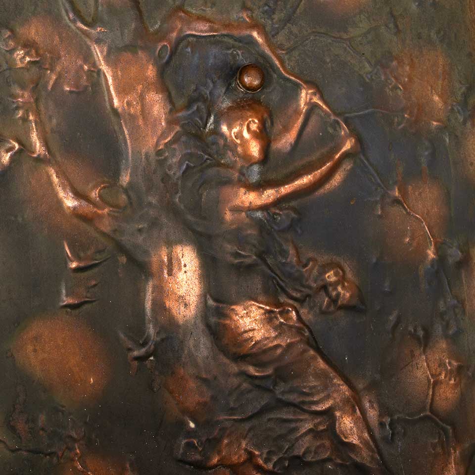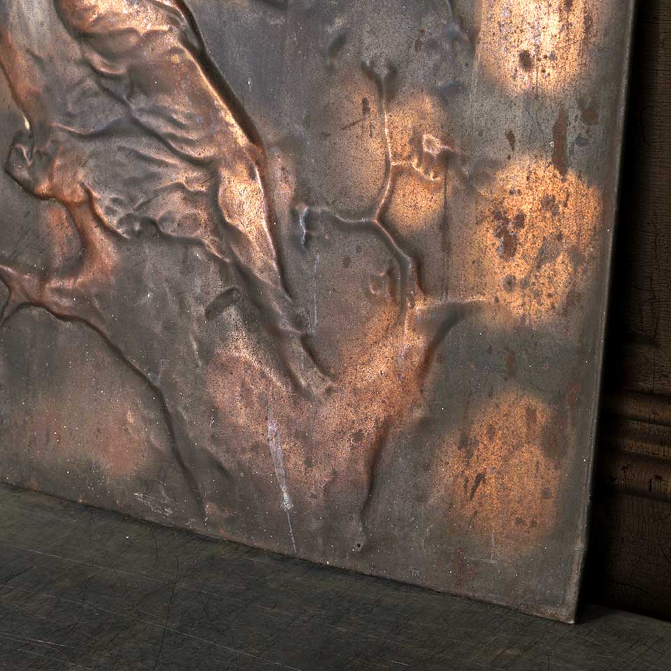 Architectural salvage antique stamped / pressed metal fireplace summer front cover with figural motif measuring approx. 24" wide x 26 1/4" tall x 1" front to back. See photos to evaluate condition.