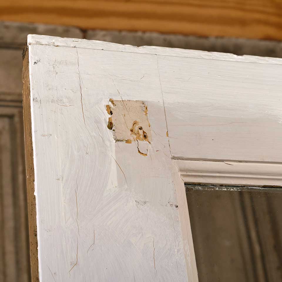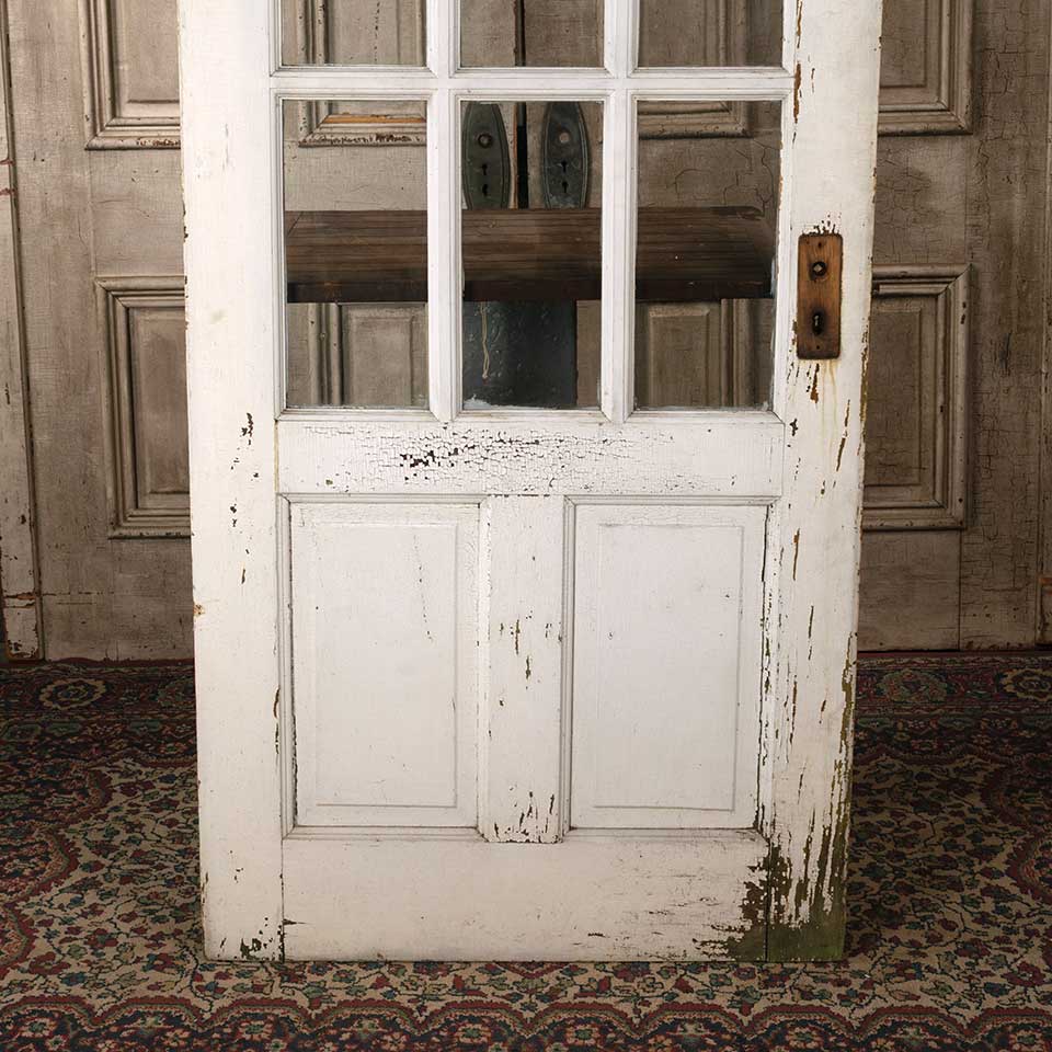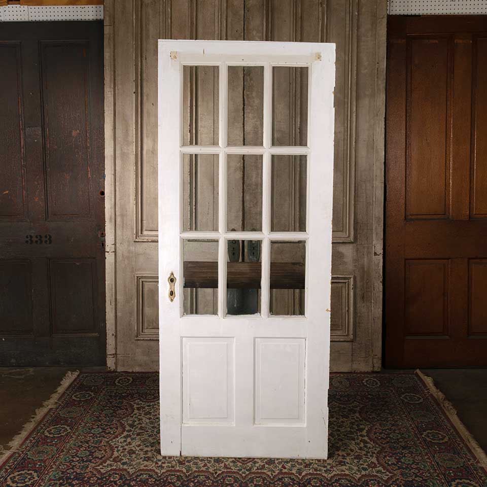 Architectural salvage antique divided nine lite painted wood entry door with mortise lock measuring approx. 31 3/4" wide x 77" tall x 1 3/8" thick. A few of the panes have lines in them that look like cracks but you can only feel them on one side of the glass. A tapered piece of wood has been added to the top of the door. See photos to evaluate condition.