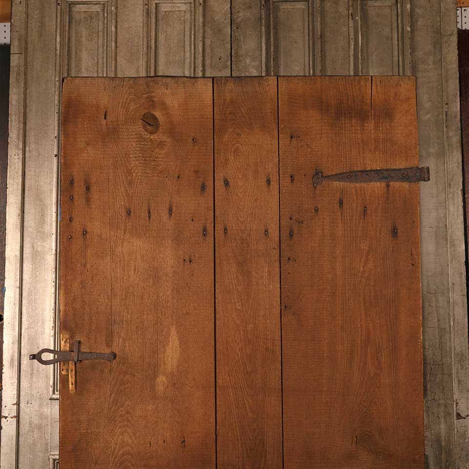 Architectural salvage antique rough sawn wood board barn door with wrought iron hardware measuring approx. 40 3/8" wide x 77 3/4" tall x 1" thick (plus 1" thick horizontal wood supports on back). See photos to evaluate condition.