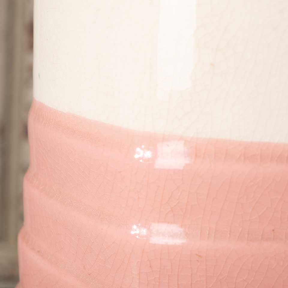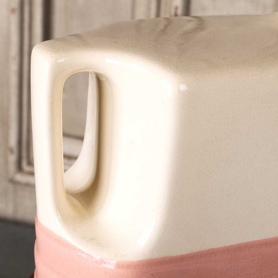 Vintage pink & white ceramic Universal Potteries Inc. refrigerator pitcher measuring approx. 4 3/4" wide x 8 1/4" tall x 7 1/4" front to back. There is a small chip on the spout. See photos to evaluate condition.