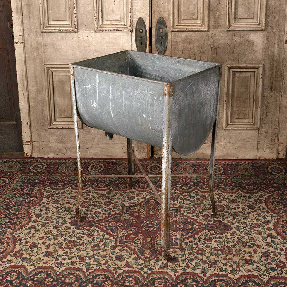 Architectural salvage antique BOSS single bowl galvanized metal washtub on casters measuring approx. 23 1/4" wide x 33 1/4" tall x 18 3/4" front to back. The original label reads: "BOSS CINCINNATI THE BOSS WASHING MACHINE COMPANY CINCINNATI, OHIO Established 1889." See photos to evaluate condition.