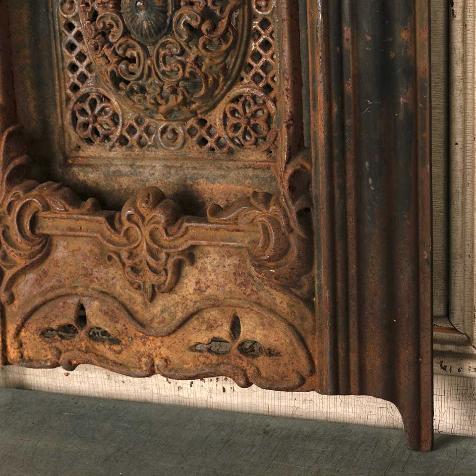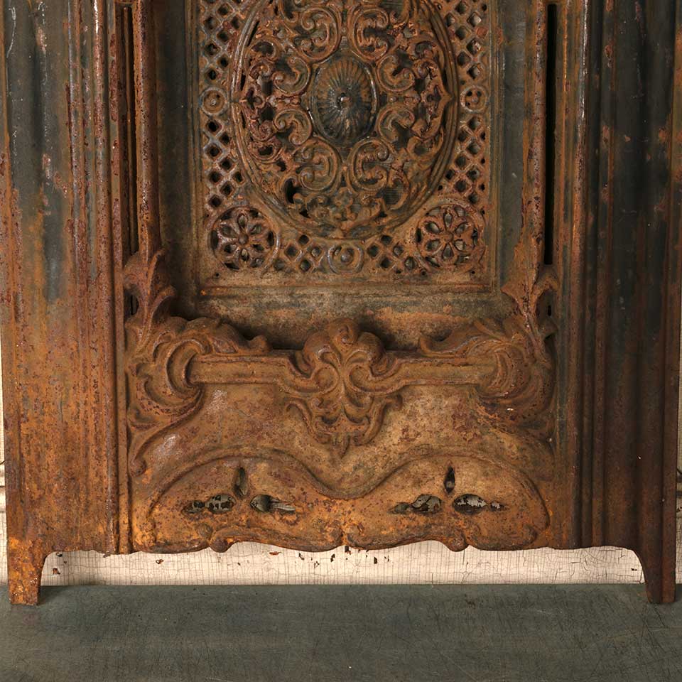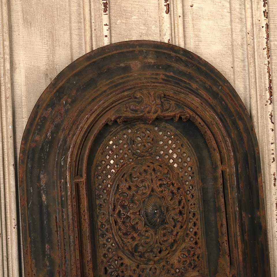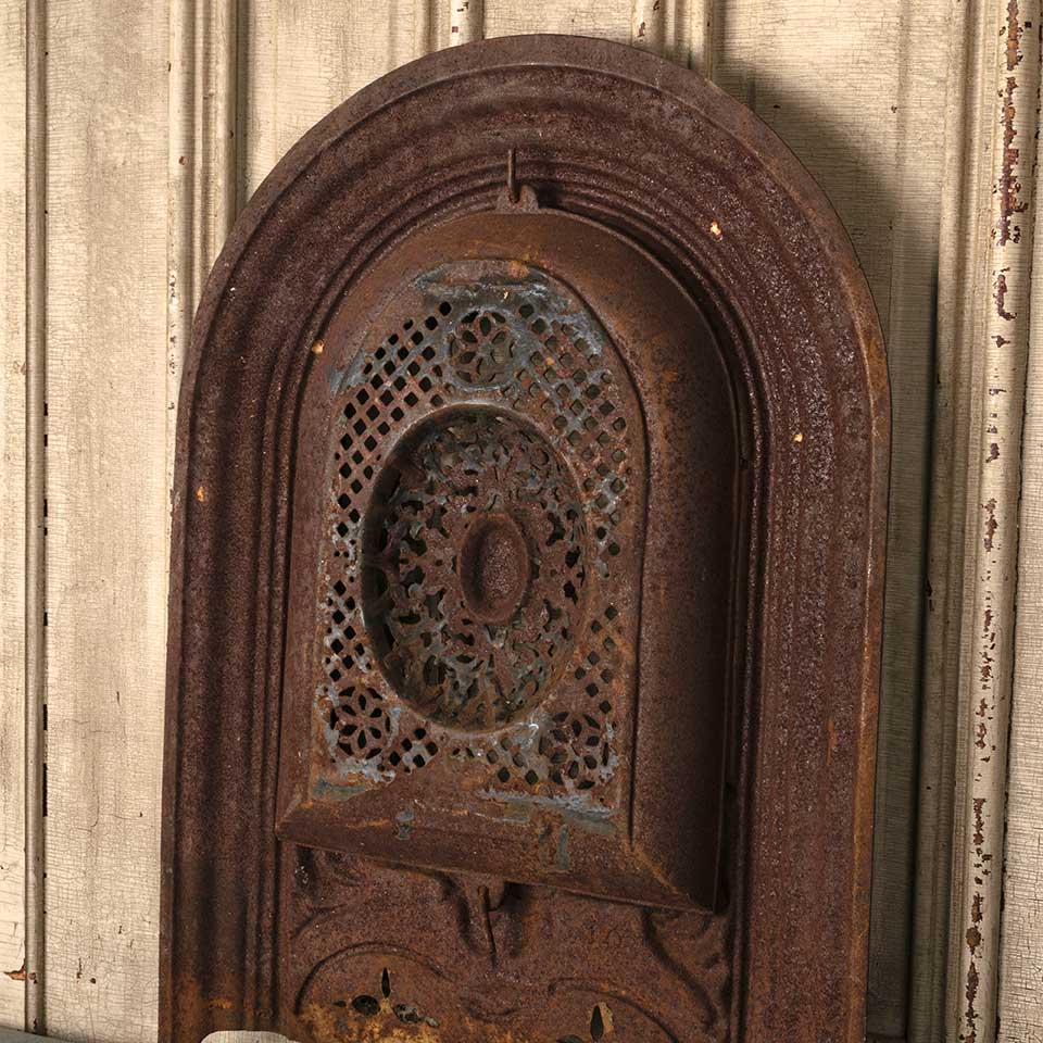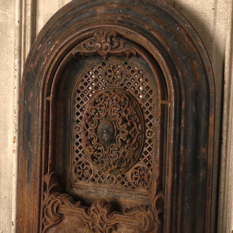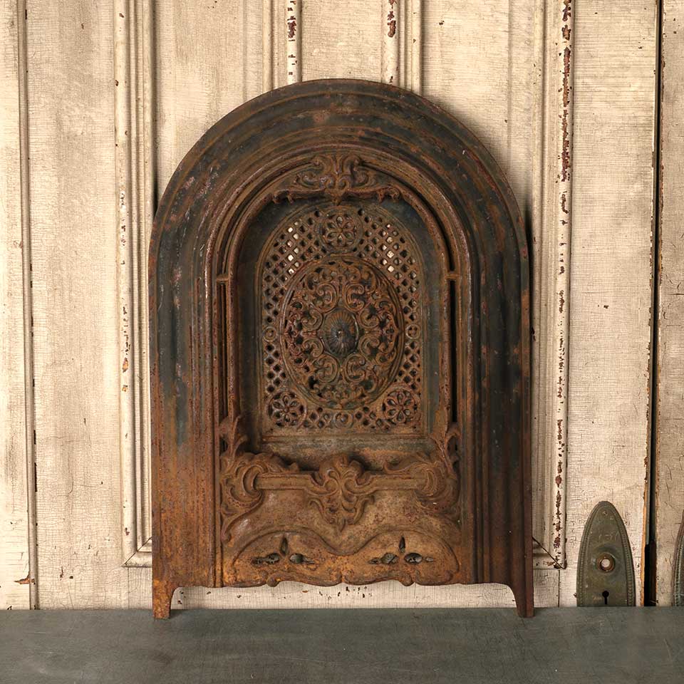 Architectural salvage antique ornate arched top cast iron fireplace summer front cover measuring approx. 19 13/16" wide x 27 7/8" tall x 2 1/2" front to back. See photos to evaluate condition.