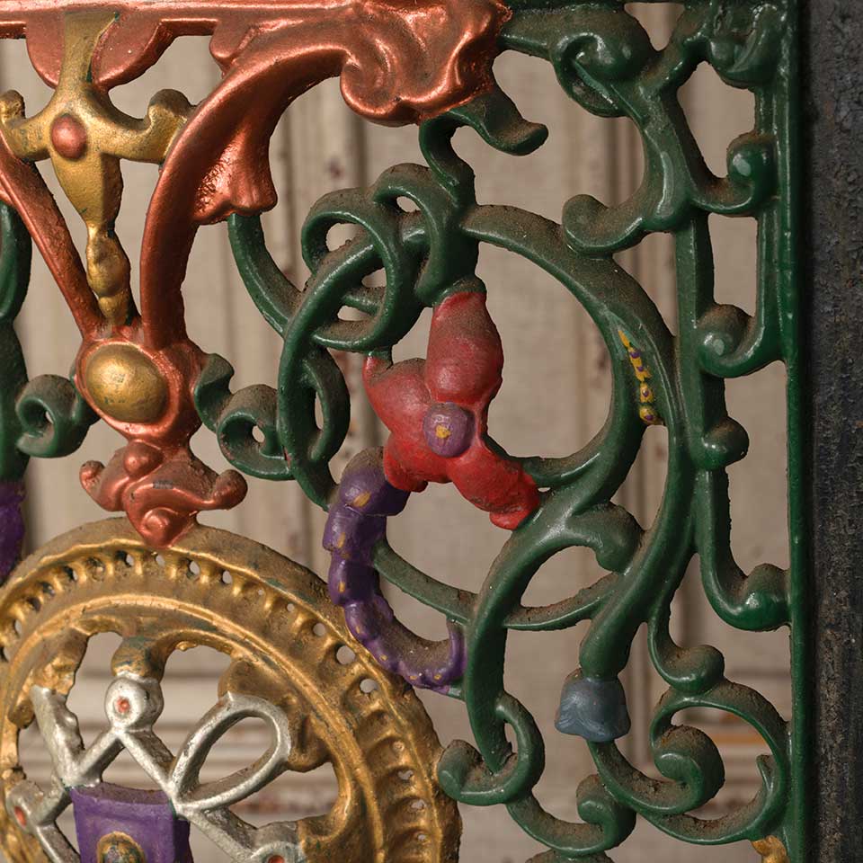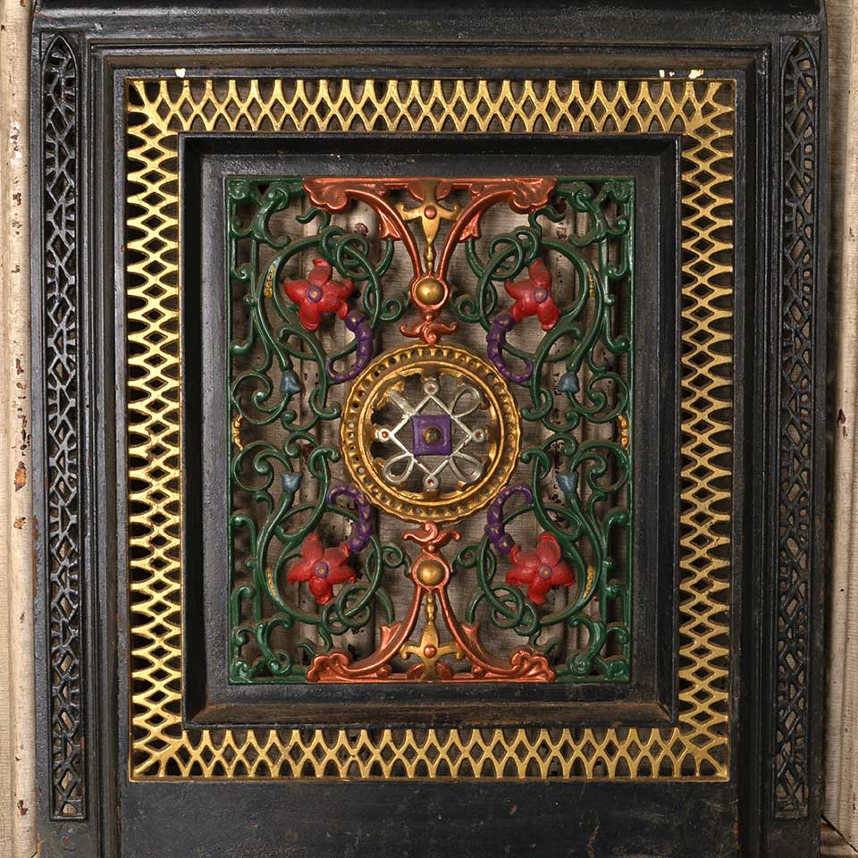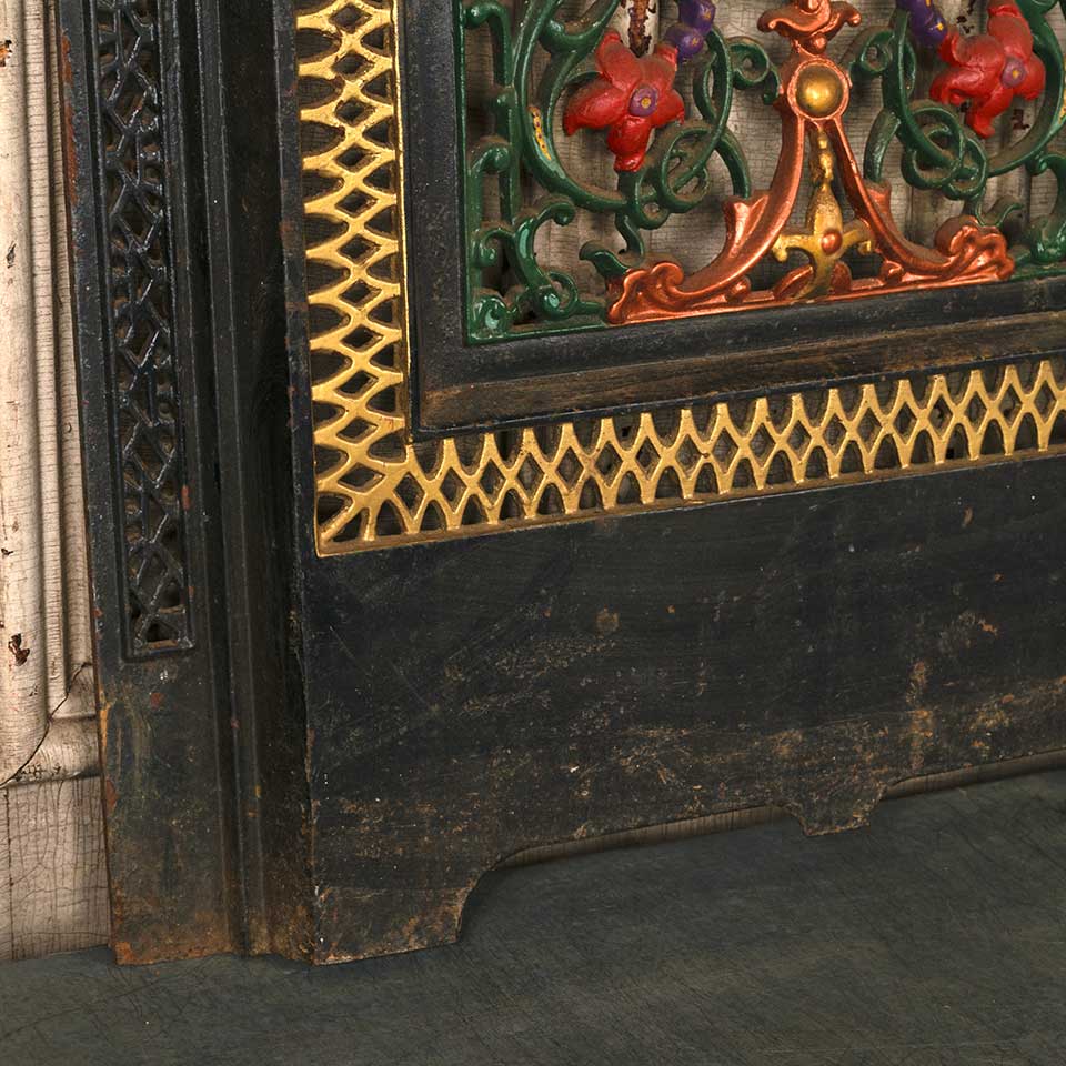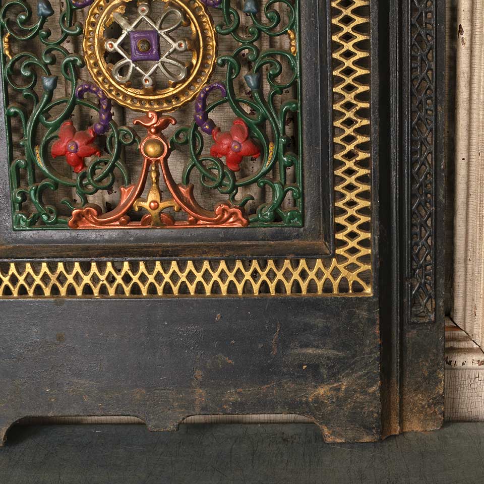 Architectural salvage antique painted cast iron fireplace summer front cover measuring approx. 20 5/8" wide x 26 1/2" tall x 1 1/2" front to back. There's a crack at the top left corner and the top right flower ornament is missing a petal. See photos to evaluate condition.