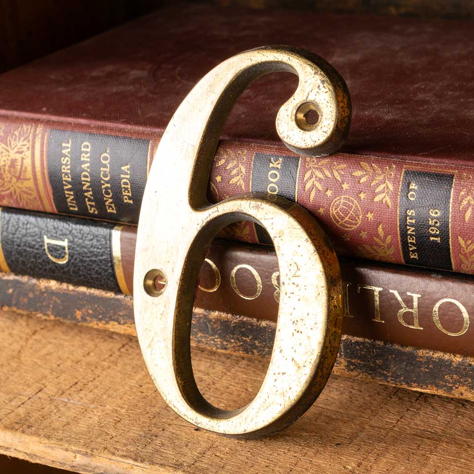 Salvaged vintage brass address numbers each measuring 2 3/8" wide x 4" tall x 1/4" thick. Numbers 0 1 2 3 4 5 6/9 7 8 available, please contact us for quantities. Color and condition vary. Priced at $4/each.