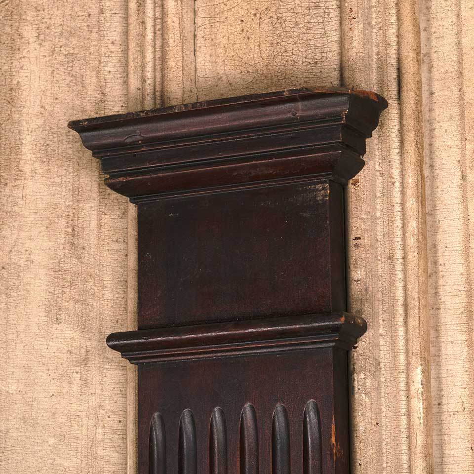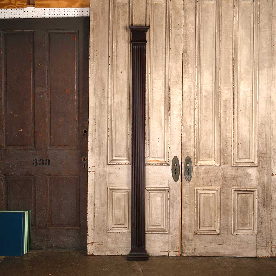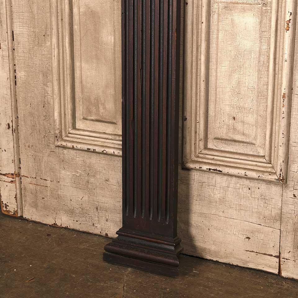 Architectural salvage antique fluted mahogany wood column pilaster trim piece measuring approx. 7 3/4" wide x 87 1/4" tall x 2 1/8" front to back. There's some wood loss at the top and bottom. See photos to evaluate condition.