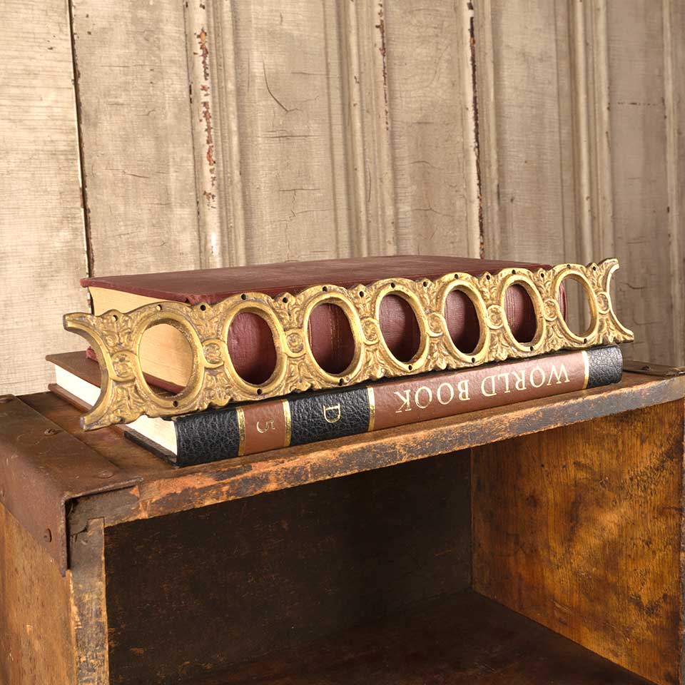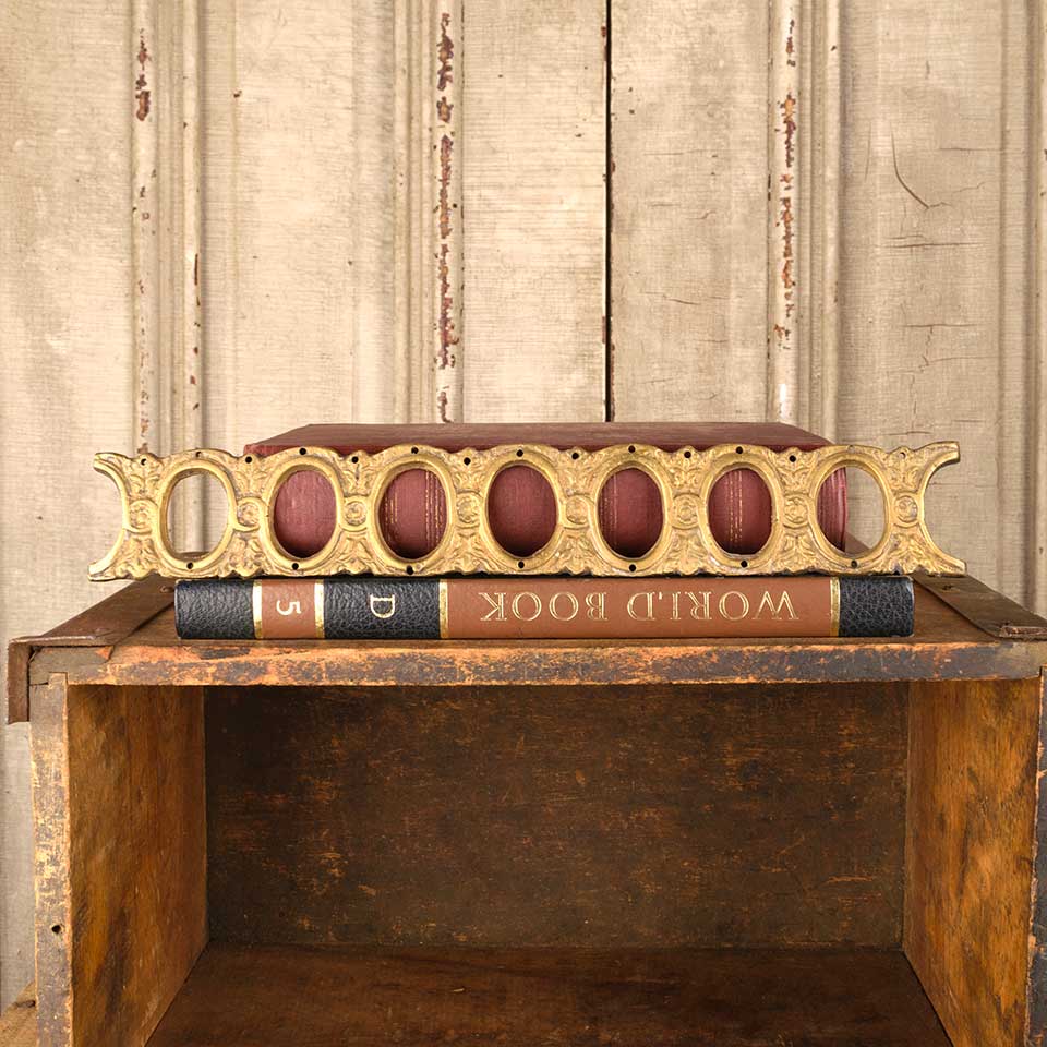 Architectural salvage ornate antique brass furniture mount trim panel measuring approx. 12 1/2" wide x 1 7/8" tall x 1/8" front to back. More available, please inquire.