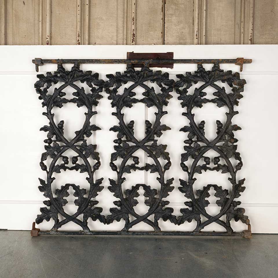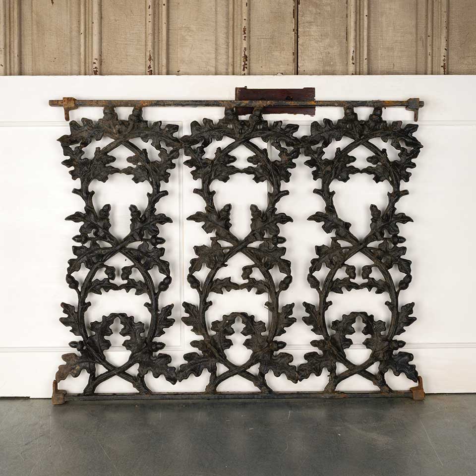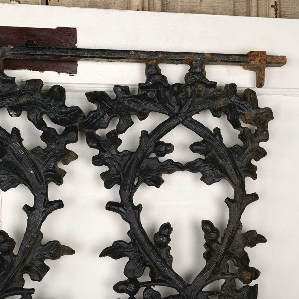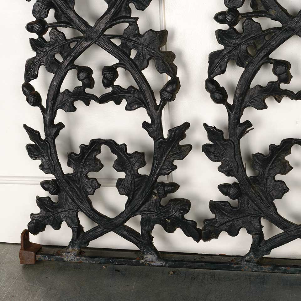 Architectural salvage vintage heavy painted cast iron railing panel with oak leaf and acorn motif measuring approx. 34 1/2" wide x 27 1/2" tall x 1 3/8" front to back. Mounting brackets included. See photos to evaluate condition.