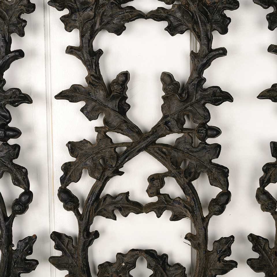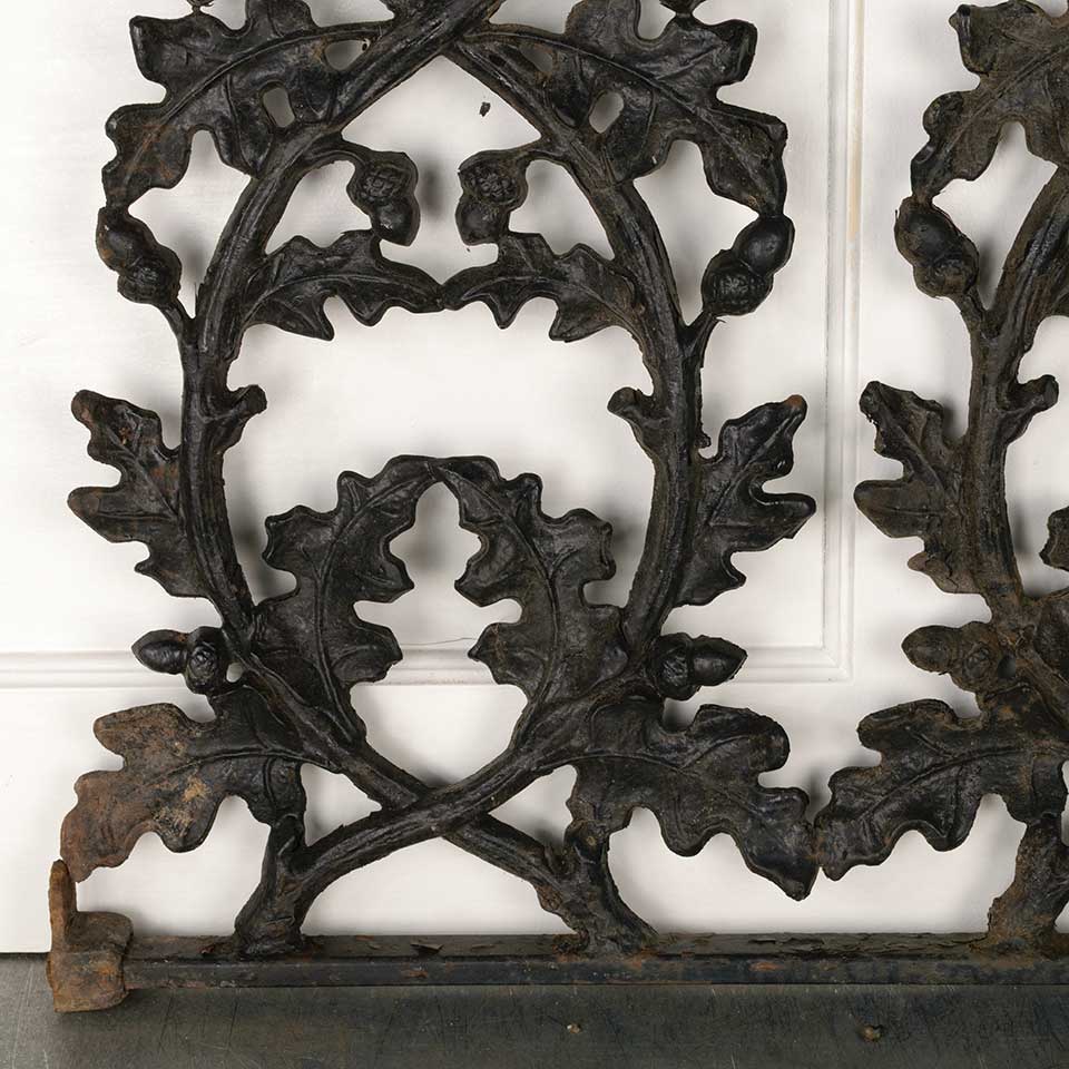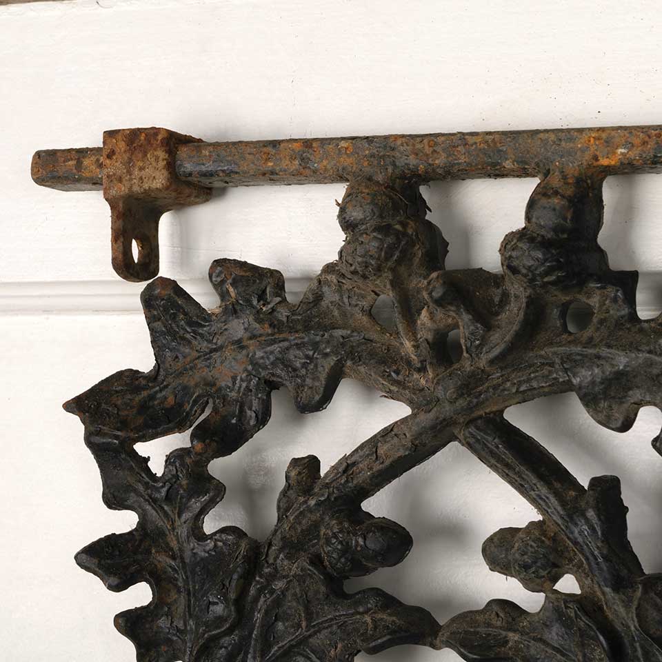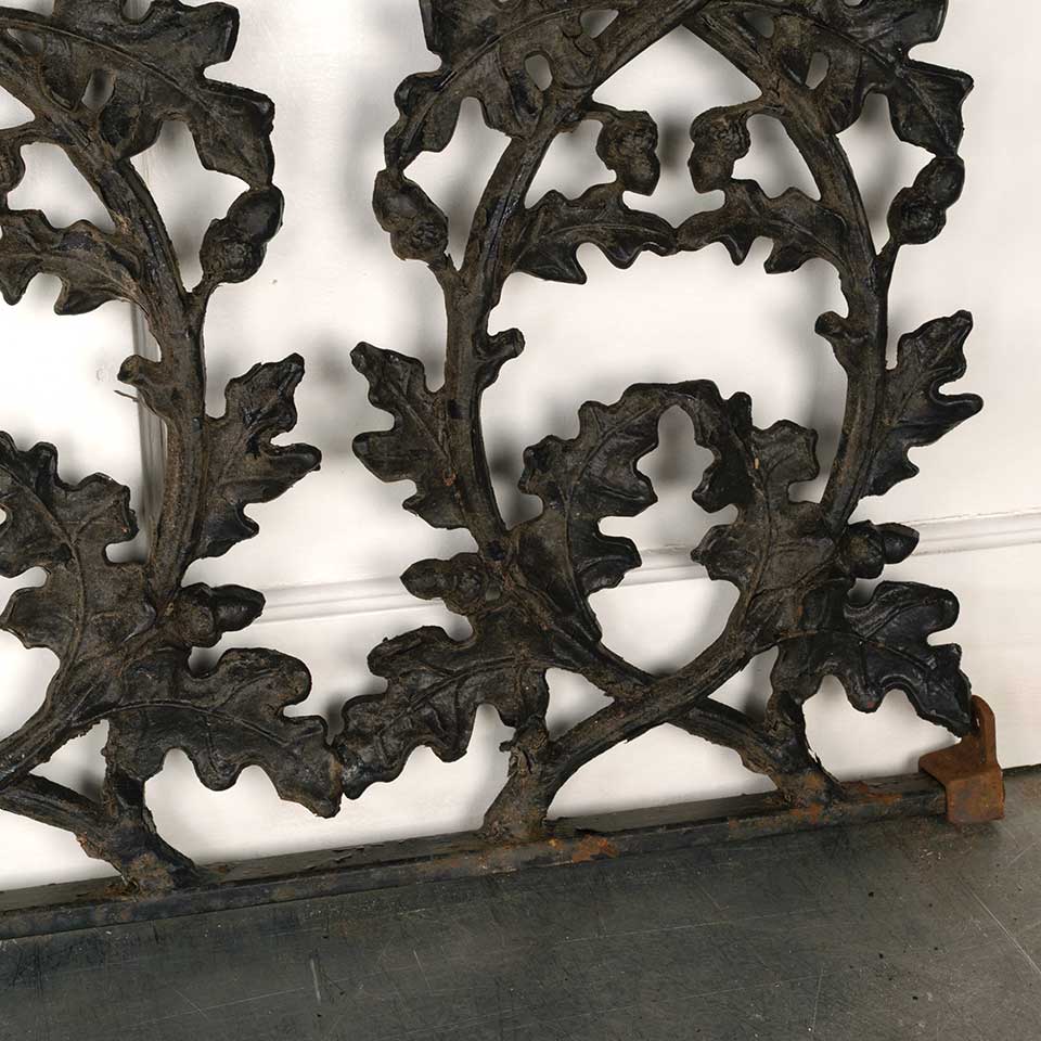 Architectural salvage vintage heavy painted cast iron railing panel with oak leaf and acorn motif measuring approx. 34 1/2" wide x 27 1/2" tall x 1 3/8" front to back. Mounting brackets included. See photos to evaluate condition.