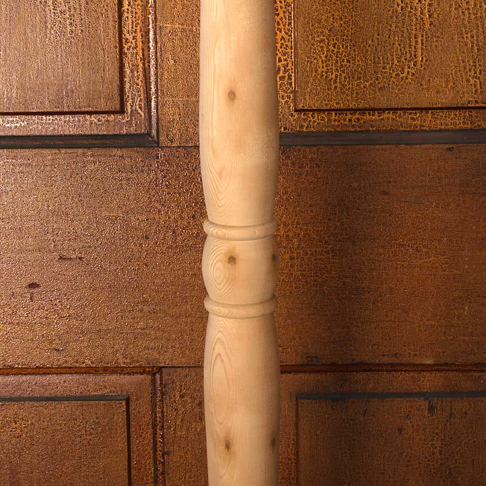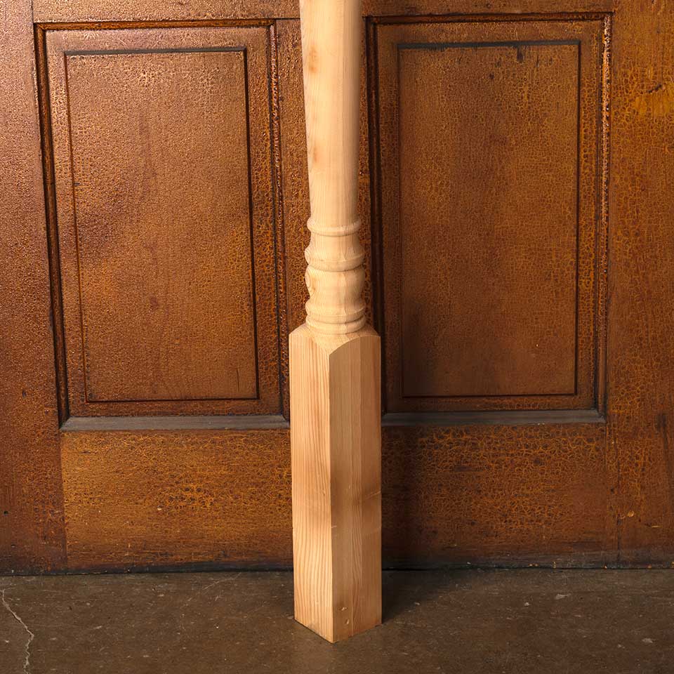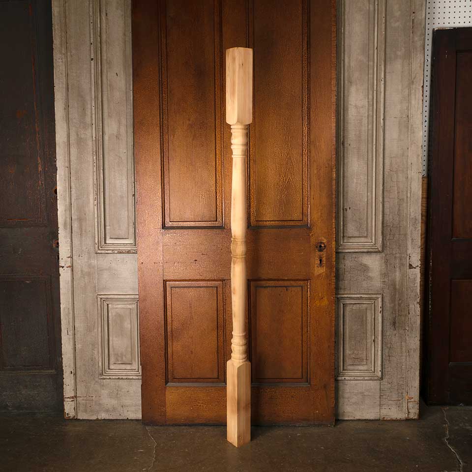 Architectural salvage never used turned wood post measuring approx. 3 1/4" x 3 1/4" x 72" tall. More available contact to inquire. Color and condition may vary.