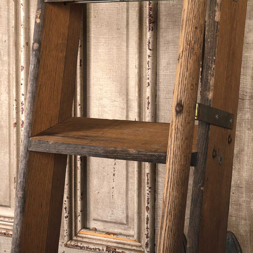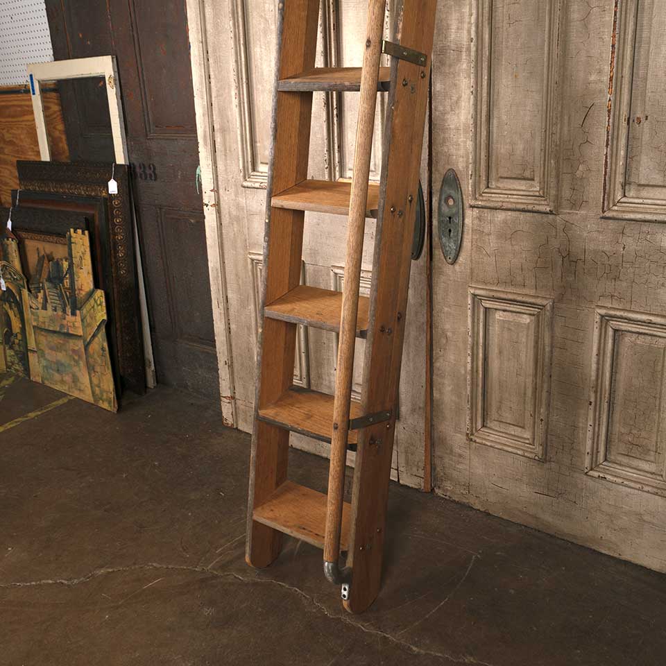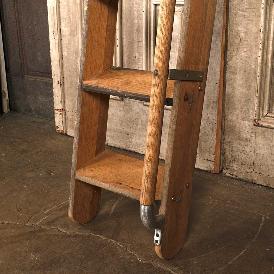 Architectural salvage nine rung oak wood library step ladder with handle measuring approx. 14" wide x 105 1/4" tall x 8 1/2" front to back. See photos to evaluate condition.