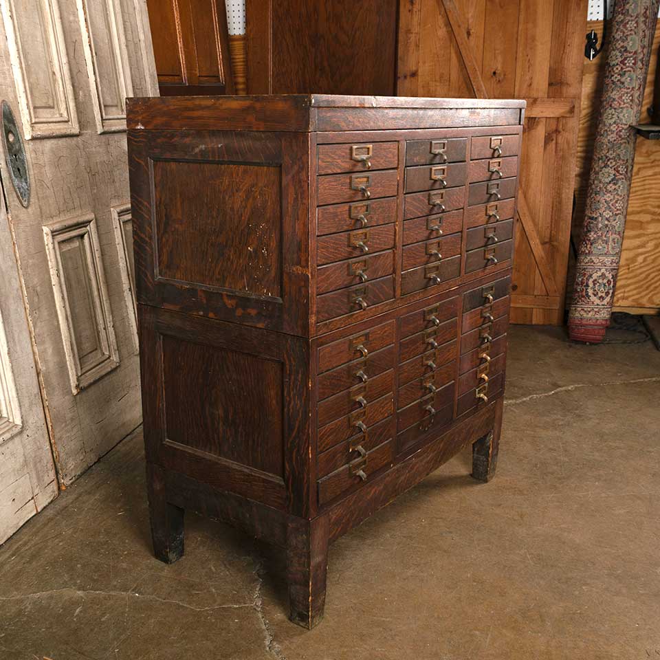 Antique Globe four piece oak stackable 36 drawer storage unit measuring approx. 33" wide x 38" tall x 17 1/4" front to back. The set includes a top, two 18 drawer units, and a base. One of the brass label handles is missing. See photos to evaluate condition.