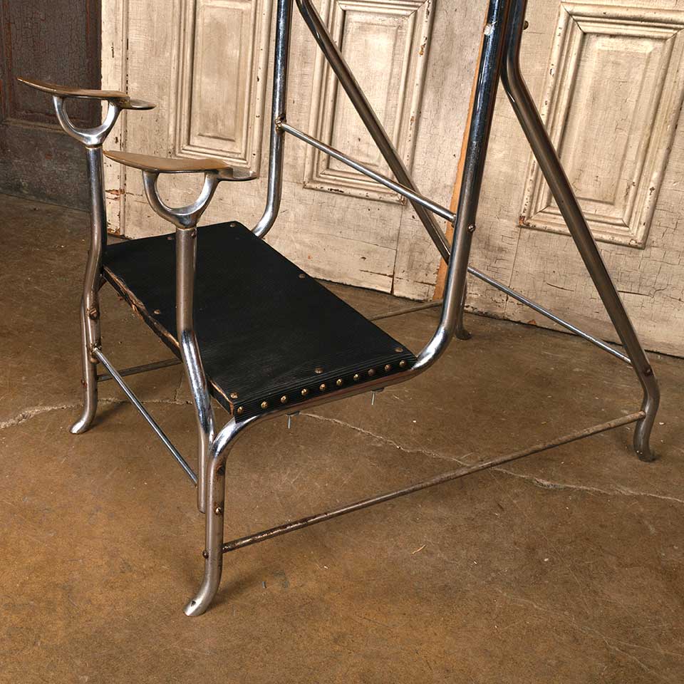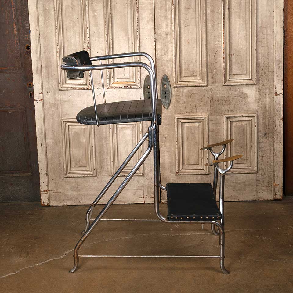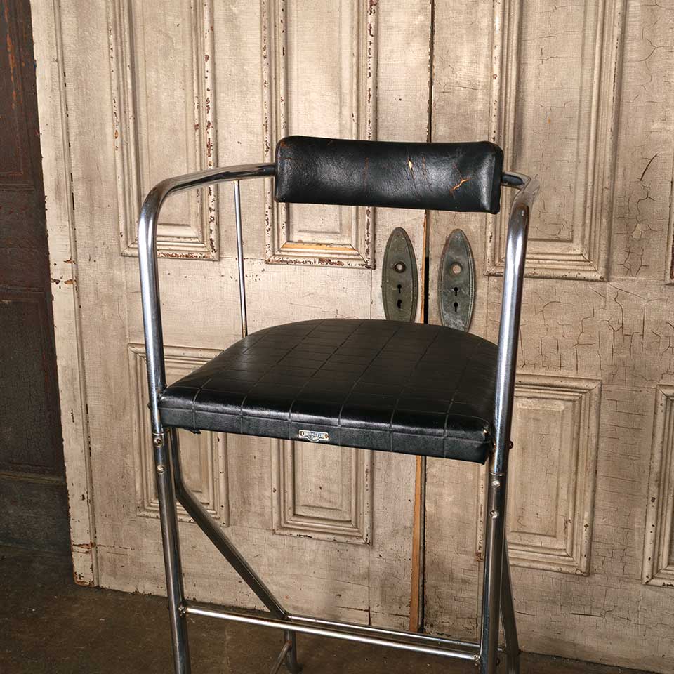 Vintage CHROMETUBE shoeshine stool highchair with brass foot rests measuring approx. 20 3/4" wide x 47 3/8" tall x 35 1/2" front to back. Manufactured by Paidar Chicago - New York. This would make a great chair for a barber shop, tattoo parlor or used as a pool table chair. The back upholstery is cracked. See photos to evaluate condition.
