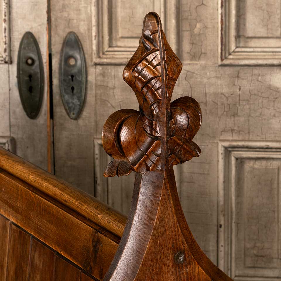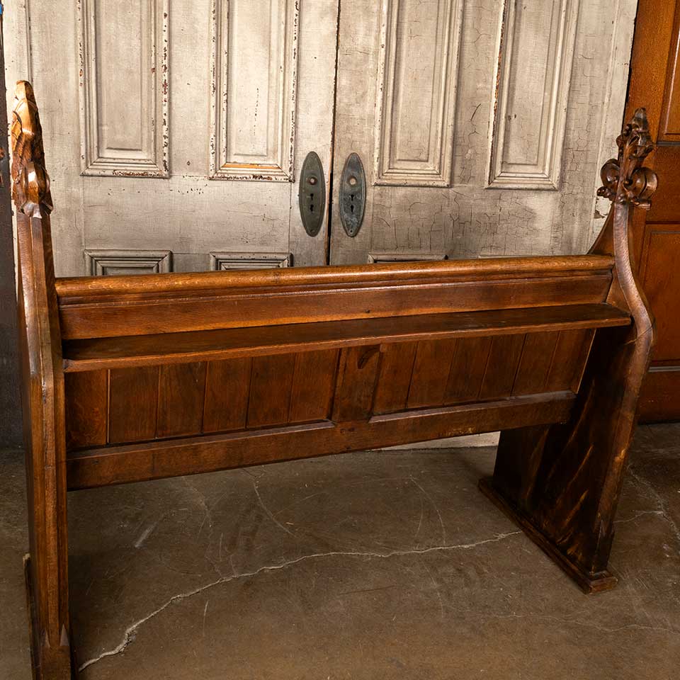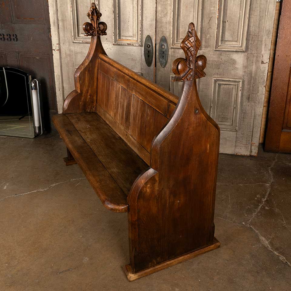 Architectural salvage antique carved wood church pew bench measuring approx. 56 7/8" wide x 48" tall x 25" front to back. Carved finials are different. See photos to evaluate condition.